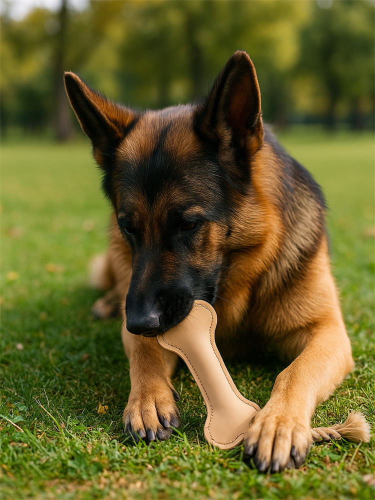 Игрушка-косточка с хлопковым канатом из натуральной кожи для чистки зубов, коррекции поведения и снятия стресса у собак. Для всех пород. Долговечная игрушка из телячьей кожи натурального дубления с технологией ручной прошивки прочным шорно-седельным швом вощеными нитками, придется по вкусу как щенкам, так и взрослым собакам. Кожаная игрушка из натуральной кожи - косточка с хлопковым канатом для чистки зубов — это полезное и увлекательное изделие, сочетающее в себе функциональность и развлечение. Изготовленная из натуральной кожи без вредных примесей химии , эта игрушка обладает прочностью и долговечностью, выдерживая активные игры вашего питомца, но будет роно или поздно разгрызана). Форма косточки удобна для захватывания зубами, а приятный материал делает процесс игры комфортным и приятным. Натуральная кожа своим хрустом не только возбуждают природные охотничьи инстинкты, но и помогают формировать правильный прикус и развивать жевательные мышцы и укреплять зубы. Хлопковый канат, прикрепленный к косточке, играет важную роль в уходе за пастью. Во время игры канат аккуратно очищает зубы и массирует десны, предотвращая образование зубного камня и поддерживая здоровье полости рта. Хлопковый канат также помогает удовлетворить природное стремление к разгрызанию предметов, направляя эту энергию в безопасное русло, сохраняя вашу мебель и обувь. Сильный аромат кожи привлекает внимание. Экологически чистые и натуральные материалы, использующиеся для создания игрушки, делают её абсолютно безопасной. Перед использованием игрушки проверьте её на повреждения и не оставляйте собаку без присмотра. Прекратите использование игрушки-косточки при повреждениях лучше купите новую. Если питомец проглотил часть игрушки, в избежании неприятностей обратитесь к ветеринару. Размер: 22 см на 11 см.