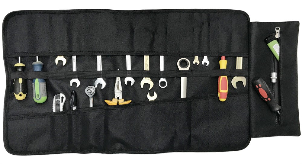 Сумка-скрутка изготовлена из прочной ткани ПВХ плотностью 600 Дэн. Изделие прямоугольной формы, закрывается на ремешка 2.2 см с защелкой-фастэкс. Имеется резинка шириной 2 см для дополнительной фиксации инструмента. Внутри сумки-скрутки проложена пенка толщиной 3 мм. Для удобного использования пришита ручка. Сумка сворачивается в рулон и не занимает много места.