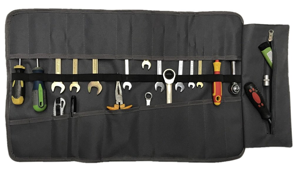 Сумка-скрутка изготовлена из прочной ткани ПВХ плотностью 600 Дэн. Изделие прямоугольной формы, закрывается на ремешка 2.2 см с защелкой-фастэкс. Имеется резинка шириной 2 см для дополнительной фиксации инструмента. Внутри сумки-скрутки проложена пенка толщиной 3 мм. Для удобного использования пришита ручка. Сумка сворачивается в рулон и не занимает много места.