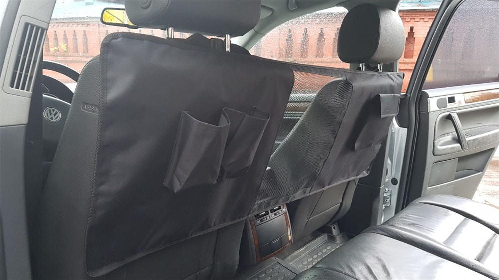Защитная перегородка ограничивает передвижение собаки по автомобилю. Прочная и надежная защита спинок сидений от когтей и зубов животного. Полупрозрачная сетка не мешает обзору водителя. Удобные карманы для всяких мелочей Вашего питомца. Изготовлена из ткани ПВХ 600 Ден и прочной сетки из полипропелена. Быстрая и простая установка и снятие перегородки.